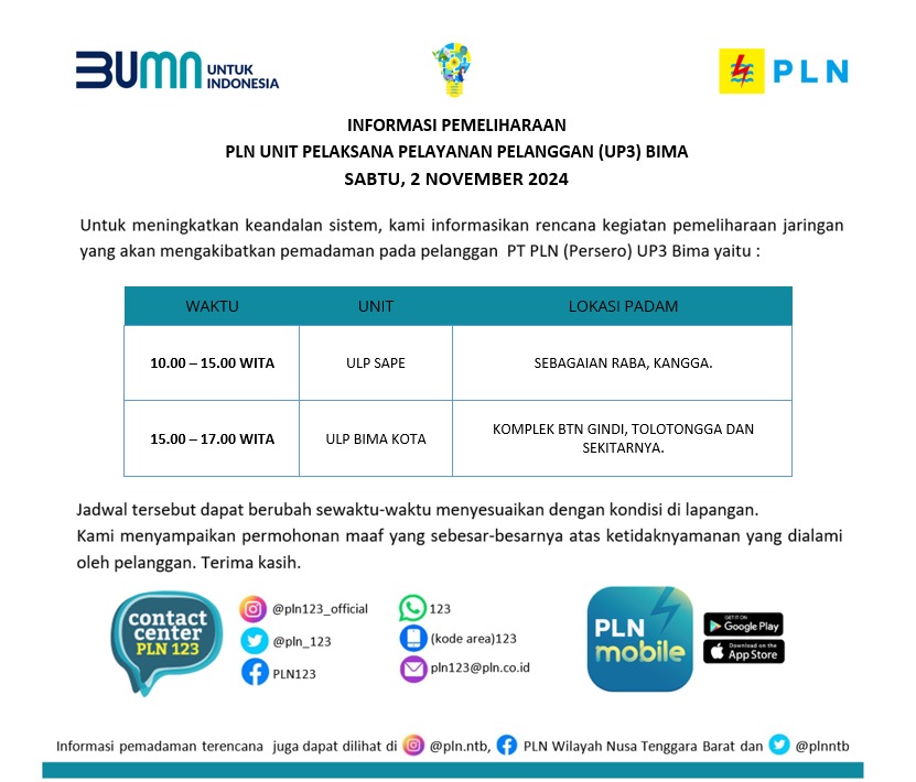 Informasi Pemeliharaan Jaringan PT. PLN (Persero) UP3 Bima, Sabtu 2 November 2024 timlensaposntbNovember 1, 2024November 1, 2024413 Dilihat Post Views: 413 Pos terkaitPatroli Cipta Kondisi Koramil 1608-01/Rasanae Sasar Knalpot Racing dan MirasSapi Liar Kembali Makan Korban di Kota Bima, Ambulans Pembawa Ibu Hamil Tabrakan di Jalan ProtokolPenerimaan Mahasiswa Baru Akbid Surya Mandiri Bima (SMB) Tahun Akademik 2026/2027Informasi Pemeliharaan Jaringan PT. PLN (Persero) UP3 Bima, Senin 20 April 2026Safari Mobil Maung di Amahami Diserbu Warga, Kodim 1608/Bima Kenalkan Karya Anak BangsaInovasi Hebat! SDN 1 Melayu Kota Bima Ubah Limbah MBG Jadi Eco Enzym
