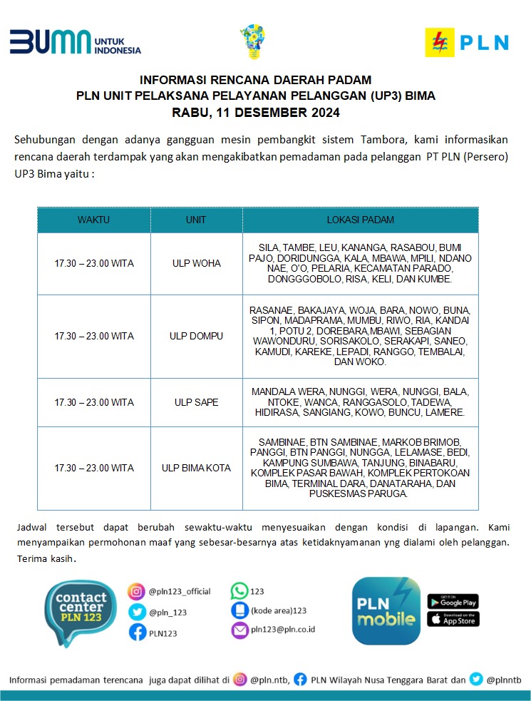 Informasi Pemeliharaan Jaringan PT. PLN (Persero) UP3 Bima, Rabu 11 Desember 2024 timlensaposntbDesember 11, 2024Desember 11, 2024285 Dilihat Post Views: 285 Pos terkaitLangkah Besar Pendidikan, Pemkot Bima dan Unbim Internasional MFH Resmi BerkolaborasiIkbal Tanjung, S.Pd Siap Bangun SDN 29 Tanjung Kota Bima Lebih BerkualitasPerkuat Stabilitas Keamanan Wilayah, Kepala Rutan Raba Hadiri Pemusnahan Senpi Rakitan oleh Kodim 1608/BimaDandim 1608/ Bima Pimpin Pemusnahan Senpi Rakitan Hasil Operasi Teritorial TNI Tahun 2025118 Mahasiswa Akbid Surya Mandiri Bima Ikuti Praktikum Anatomi di Universitas Udayana BaliRektor UNSWA Dr. Tasrif Azis Hadiri Pemusnahan Barang Bukti Senpi Rakitan di Makodim 1608/ Bima