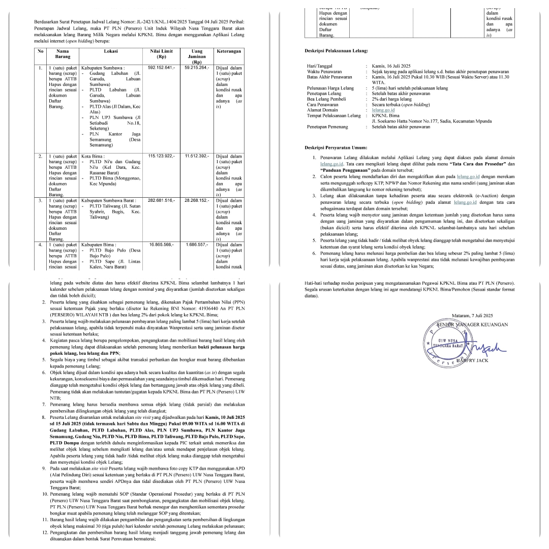 Pengumuman Lelang PT. PLN (Persero) UP3 Bima timlensaposntbJuli 9, 2025Juli 9, 2025229 Dilihat Post Views: 229 Pos terkaitInformasi Pemeliharaan Jaringan PT. PLN (Persero) UP3 Bima, Rabu 22 April 2026SiPropam Polres Bima Kota Gencarkan Sosialisasi Rekrutmen Polri Bersih Lewat Banner dan PamfletPatroli Cipta Kondisi, Koramil 1608-01/ Rasanae Ajak Warga Jaga Keamanan LingkunganIndra Sukma Resmi Pimpin Lapas Khusus Sentul, Karier Melejit dari Rutan Raba hingga LPKA TomohonSiap Berangkat! 221 Jamaah Haji Kota Bima Sudah Terima Seluruh PerlengkapanKoordinator Pengawas SD Monitoring Pelaksanaan TKA di SDN 1 Melayu Kota Bima