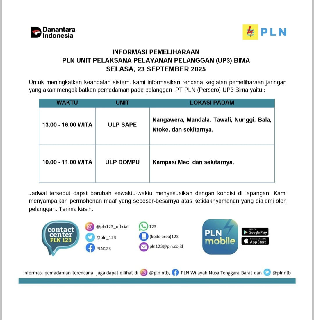 Informasi Pemeliharaan Jaringan PT. PLN (Persero) UP3 Bima, Selasa 23 September 2025 timlensaposntbSeptember 22, 2025September 22, 2025166 Dilihat Post Views: 166 Pos terkaitKasat Lantas Polres Bima Kota Hadiri Rapat Persiapan Festival Rimpu Mantika 2026, Pengamanan dan Rekayasa Lalu Lintas DibahasMelanjutkan Semangat Kartini, Jasa Raharja Dorong Perempuan Lebih BerdayaEnam Siswa SDN 19 Rabangodu Utara Kota Bima Sukses Ikuti Hari Pertama TKAKadis Dikpora Kota Bima Drs. H. Mahfud, M.Pd Pantau TKA di SDN 19 Rabangodu Utara, Dandim 1608/Bima Turut HadirEnam Siswa SDN 19 Kota Bima Akhirnya Ikuti TKA Gelombang II, Dinas Dikpora Beri Jaminan Lanjut ke SMP Tanpa HambatanInformasi Pemeliharaan Jaringan PT. PLN (Persero) UP3 Bima, Rabu 22 April 2026