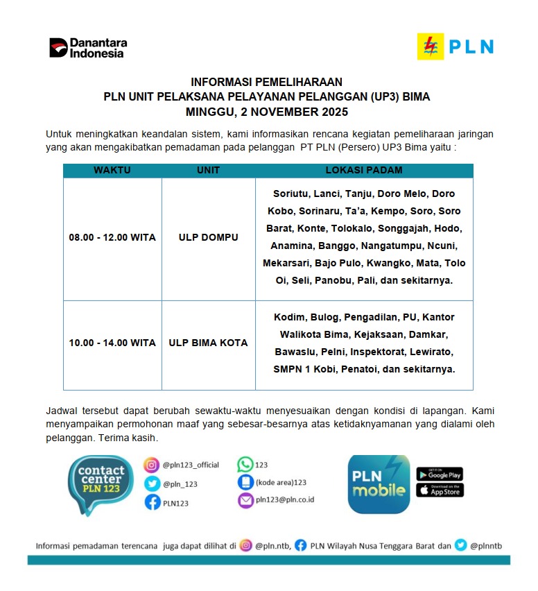 Informasi Pemeliharaan Jaringan PT. PLN (Persero) UP3 Bima, Minggu 2 November 2025 timlensaposntbNovember 1, 2025November 1, 2025165 Dilihat Post Views: 165 Pos terkaitSpektakuler! Festival Rimpu Mantika 2026 di Kota Bima Target Libatkan 85 Ribu PesertaMelanjutkan Semangat Kartini, Jasa Raharja Dorong Perempuan Lebih BerdayaEnam Siswa SDN 19 Rabangodu Utara Kota Bima Sukses Ikuti Hari Pertama TKAKadis Dikpora Kota Bima Drs. H. Mahfud, M.Pd Pantau TKA di SDN 19 Rabangodu Utara, Dandim 1608/Bima Turut HadirEnam Siswa SDN 19 Kota Bima Akhirnya Ikuti TKA Gelombang II, Dinas Dikpora Beri Jaminan Lanjut ke SMP Tanpa HambatanInformasi Pemeliharaan Jaringan PT. PLN (Persero) UP3 Bima, Rabu 22 April 2026