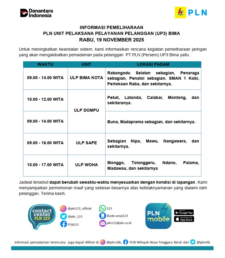 Informasi Pemeliharaan Jaringan PT. PLN (Persero) UP3 Bima, Rabu 19 November 2025 timlensaposntbNovember 18, 2025November 18, 2025116 Dilihat Post Views: 116 Pos terkaitInformasi Pemeliharaan Jaringan PT. PLN (Persero) UP3 Bima, Rabu 22 April 2026SiPropam Polres Bima Kota Gencarkan Sosialisasi Rekrutmen Polri Bersih Lewat Banner dan PamfletPatroli Cipta Kondisi, Koramil 1608-01/ Rasanae Ajak Warga Jaga Keamanan LingkunganIndra Sukma Resmi Pimpin Lapas Khusus Sentul, Karier Melejit dari Rutan Raba hingga LPKA TomohonSiap Berangkat! 221 Jamaah Haji Kota Bima Sudah Terima Seluruh PerlengkapanKoordinator Pengawas SD Monitoring Pelaksanaan TKA di SDN 1 Melayu Kota Bima