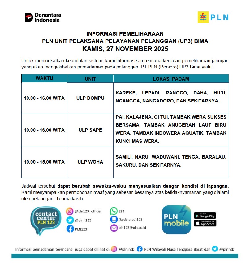Informasi Pemeliharaan Jaringan PT. PLN (Persero) UP3 Bima, Kamis 27 November 2025 timlensaposntbNovember 26, 2025November 26, 202599 Dilihat Post Views: 99 Pos terkaitInformasi Pemeliharaan Jaringan PT. PLN (Persero) UP3 Bima, Rabu 22 April 2026SiPropam Polres Bima Kota Gencarkan Sosialisasi Rekrutmen Polri Bersih Lewat Banner dan PamfletPatroli Cipta Kondisi, Koramil 1608-01/ Rasanae Ajak Warga Jaga Keamanan LingkunganIndra Sukma Resmi Pimpin Lapas Khusus Sentul, Karier Melejit dari Rutan Raba hingga LPKA TomohonSiap Berangkat! 221 Jamaah Haji Kota Bima Sudah Terima Seluruh PerlengkapanKoordinator Pengawas SD Monitoring Pelaksanaan TKA di SDN 1 Melayu Kota Bima