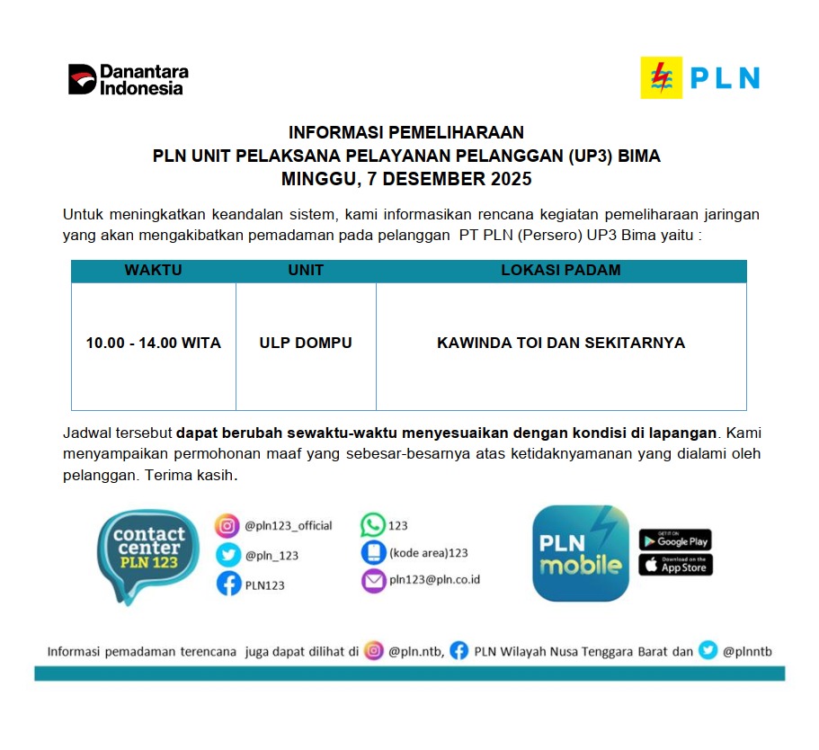 Informasi Pemeliharaan Jaringan PT. PLN (Persero) UP3 Bima, Minggu 7 Desember 2025 timlensaposntbDesember 6, 2025Desember 6, 2025145 Dilihat Post Views: 145 Pos terkaitBerbenah Cepat, Inovasi Kepala Sekolah Baru Sulap SDN 1 Melayu Jadi Asri dan RamahRaih Penghargaan Sekolah Terbersih, SDN 11 Manggemaci Terus Berinovasi Selaraskan Program Kota Bima “BISA”Informasi Pemeliharaan Jaringan PT. PLN (Persero) UP3 Bima, Sabtu 18 April 2026Dompu Perlu Social Safety Net untuk PengangguranKejari Bima Raih Dua Penghargaan Anugerah Reksa Bandha dari DJKN Bali NusraDandim 1608/Bima Pimpin Langsung Jumat Berkah, Tebar Kepedulian untuk Anak-anak SLB Kota Bima
