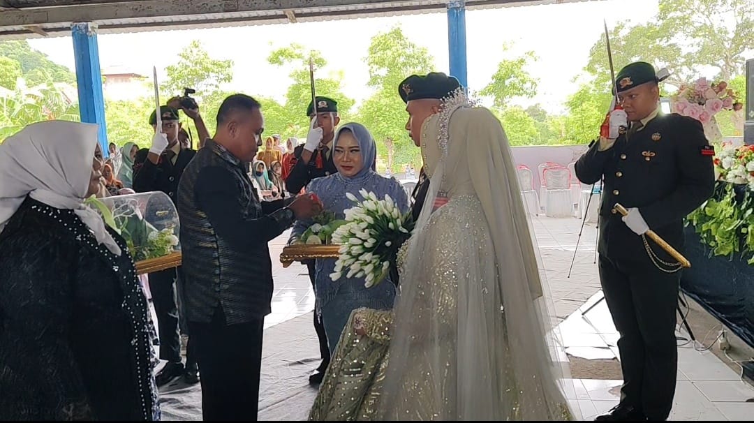 Lensa Pos NTB, Bima – Danramil 1608-02/Bolo, Lettu Caj Zulkarnain, menghadiri prosesi pernikahan secara militer salah satu anggota Kompi Senapan A Sumbawa, Praka Sarifudin, yang dilaksanakan di Gedung Desa Dena, Kecamatan Madapangga, Kabupaten Bima, pada Minggu sore (14/12/2025).