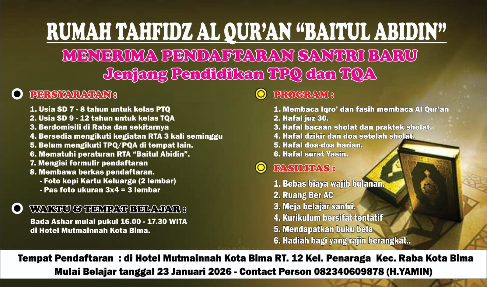 Lensa Pos NTB, Kota Bima — Rumah Tahfidz Al-Qur’an (RTQ) Baitul Abidin yang berlokasi di Hotel Mutmainnah, Kelurahan Penaraga, Kecamatan Raba, Kota Bima, Nusa Tenggara Barat (NTB), kembali membuka pendaftaran santri baru untuk Tahun 2026.