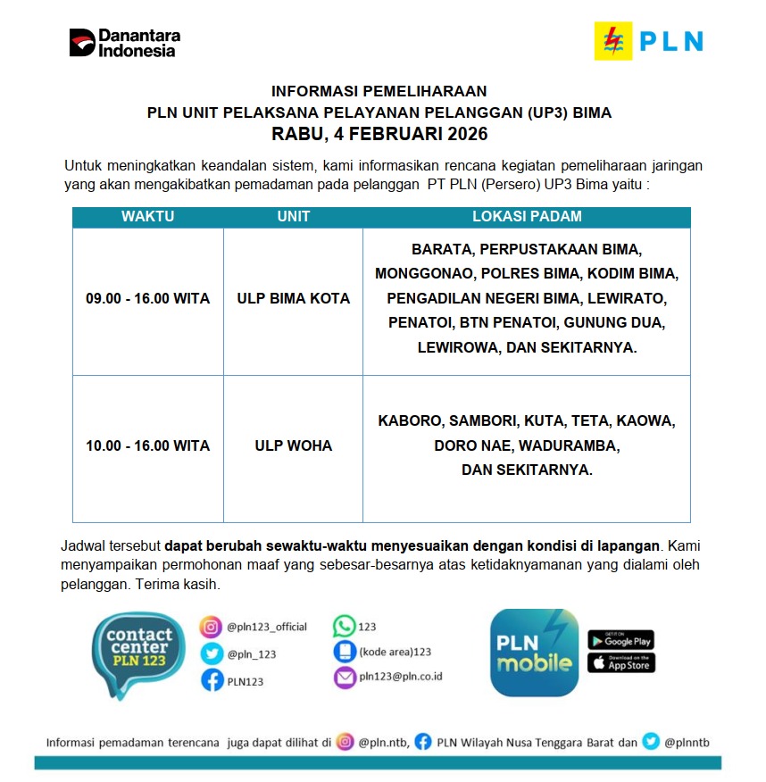 Informasi Pemeliharaan Jaringan PT. PLN (Persero) UP3 Bima, Rabu 4 Februari 2026 timlensaposntbFebruari 3, 2026Februari 3, 2026127 Dilihat Post Views: 127 Pos terkaitBerbenah Cepat, Inovasi Kepala Sekolah Baru Sulap SDN 1 Melayu Jadi Asri dan RamahRaih Penghargaan Sekolah Terbersih, SDN 11 Manggemaci Terus Berinovasi Selaraskan Program Kota Bima “BISA”Informasi Pemeliharaan Jaringan PT. PLN (Persero) UP3 Bima, Sabtu 18 April 2026Dompu Perlu Social Safety Net untuk PengangguranKejari Bima Raih Dua Penghargaan Anugerah Reksa Bandha dari DJKN Bali NusraDandim 1608/Bima Pimpin Langsung Jumat Berkah, Tebar Kepedulian untuk Anak-anak SLB Kota Bima