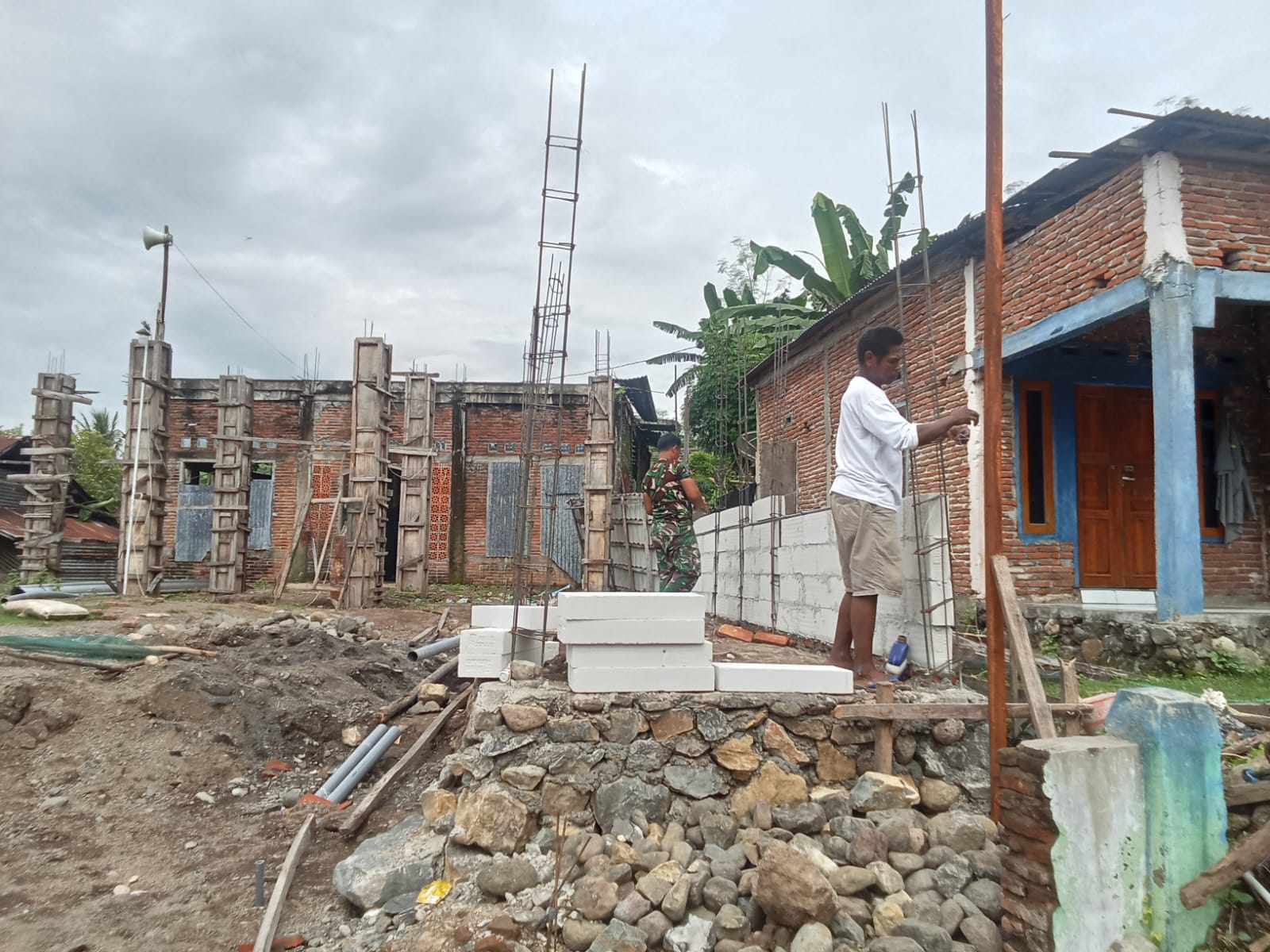 Babinsa Desa Waro, Sertu Amaral, secara konsisten melakukan pengawasan di lapangan guna memastikan setiap tahapan pekerjaan berjalan sesuai rencana dan standar kualitas bangunan tetap terjaga.