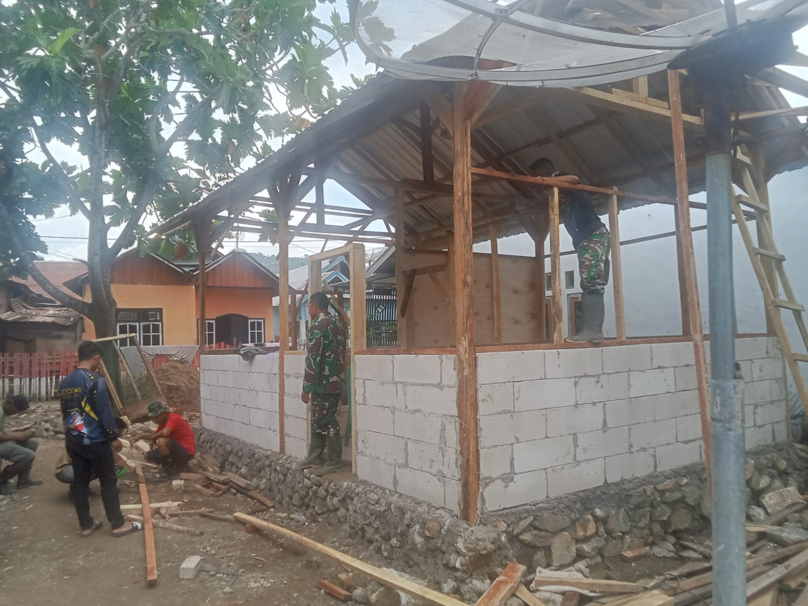 Babinsa Desa Waro, Sertu Amaral, secara aktif dan konsisten mengawasi jalannya pembangunan di lapangan. Ia memastikan setiap tahapan pekerjaan berjalan sesuai rencana dan kualitas bangunan tetap terjaga.