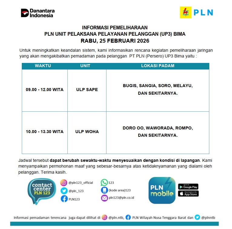 Informasi Pemeliharaan Jaringan PT. PLN (Persero) UP3 Bima, Rabu 25 Februari 2026 timlensaposntbFebruari 24, 2026Februari 24, 202697 Dilihat Post Views: 97 Pos terkaitBerbenah Cepat, Inovasi Kepala Sekolah Baru Sulap SDN 1 Melayu Jadi Asri dan RamahRaih Penghargaan Sekolah Terbersih, SDN 11 Manggemaci Terus Berinovasi Selaraskan Program Kota Bima “BISA”Informasi Pemeliharaan Jaringan PT. PLN (Persero) UP3 Bima, Sabtu 18 April 2026Dompu Perlu Social Safety Net untuk PengangguranKejari Bima Raih Dua Penghargaan Anugerah Reksa Bandha dari DJKN Bali NusraDandim 1608/Bima Pimpin Langsung Jumat Berkah, Tebar Kepedulian untuk Anak-anak SLB Kota Bima