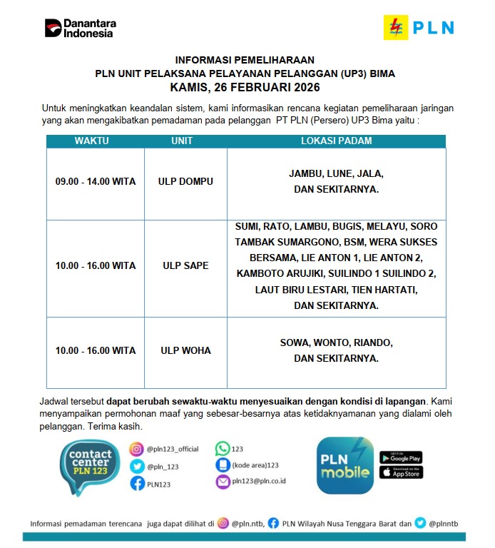 Informasi Pemeliharaan Jaringan PT. PLN (Persero) UP3 Bima, Kamis 26 Februari 2026 timlensaposntbFebruari 25, 2026Februari 25, 2026129 Dilihat Post Views: 129 Pos terkaitPenerimaan Mahasiswa Baru Akbid Surya Mandiri Bima (SMB) Tahun Akademik 2026/2027Informasi Pemeliharaan Jaringan PT. PLN (Persero) UP3 Bima, Minggu 19 April 2026Berbenah Cepat, Inovasi Kepala Sekolah Baru Sulap SDN 1 Melayu Jadi Asri dan RamahRaih Penghargaan Sekolah Terbersih, SDN 11 Manggemaci Terus Berinovasi Selaraskan Program Kota Bima “BISA”Informasi Pemeliharaan Jaringan PT. PLN (Persero) UP3 Bima, Sabtu 18 April 2026Dompu Perlu Social Safety Net untuk Pengangguran