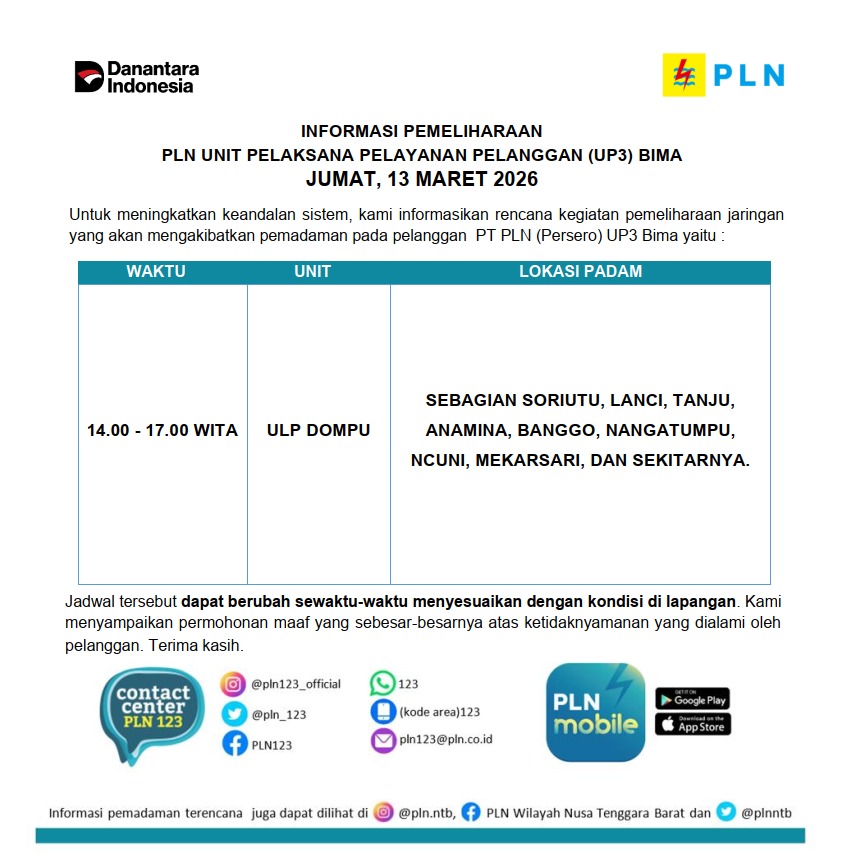 Informasi Pemeliharaan Jaringan PT. PLN (Persero) UP3 Bima, Jumat 13 Maret 2026 timlensaposntbMaret 12, 2026Maret 12, 202668 Dilihat Post Views: 68 Pos terkaitSafari Mobil Maung di Amahami Diserbu Warga, Kodim 1608/Bima Kenalkan Karya Anak BangsaInovasi Hebat! SDN 1 Melayu Kota Bima Ubah Limbah MBG Jadi Eco EnzymPatroli Cipta Kondisi, Koramil 1608-01/ Rasanae Sikat Knalpot Racing Pengganggu WargaForum Anak: Alat Pencitraan Pemerintah Daerah?Bupati Bima Rotasi 10 Pejabat Eselon II, Ini Daftar LengkapnyaPenerimaan Mahasiswa Baru Akbid Surya Mandiri Bima (SMB) Tahun Akademik 2026/2027