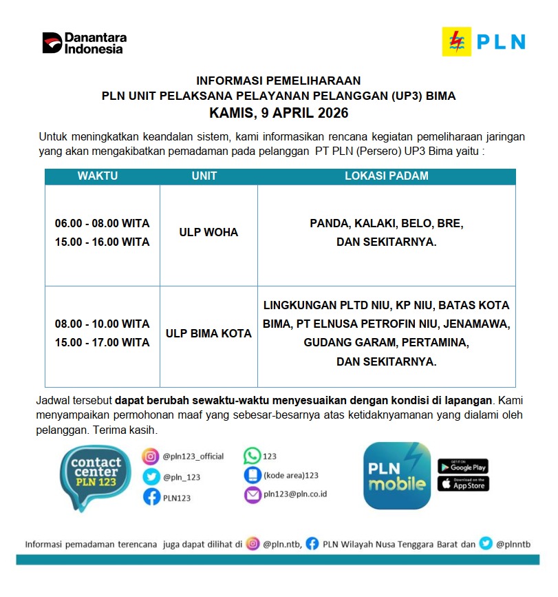 Informasi Pemeliharaan Jaringan PT. PLN (Persero) UP3 Bima, Kamis 9 April 2026 timlensaposntbApril 8, 2026April 8, 202656 Dilihat Post Views: 56 Pos terkaitPenerimaan Mahasiswa Baru Akbid Surya Mandiri Bima (SMB) Tahun Akademik 2026/2027Informasi Pemeliharaan Jaringan PT. PLN (Persero) UP3 Bima, Minggu 19 April 2026Berbenah Cepat, Inovasi Kepala Sekolah Baru Sulap SDN 1 Melayu Jadi Asri dan RamahRaih Penghargaan Sekolah Terbersih, SDN 11 Manggemaci Terus Berinovasi Selaraskan Program Kota Bima “BISA”Informasi Pemeliharaan Jaringan PT. PLN (Persero) UP3 Bima, Sabtu 18 April 2026Dompu Perlu Social Safety Net untuk Pengangguran