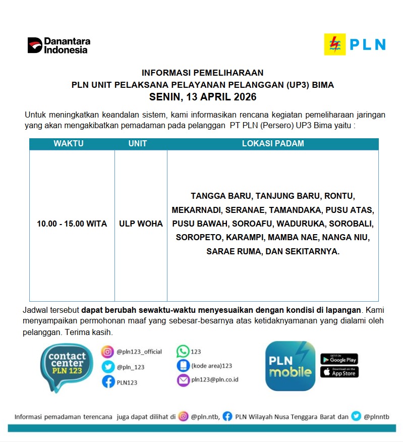 Informasi Pemeliharaan Jaringan PT. PLN (Persero) UP3 Bima, Senin 13 April 2026 timlensaposntbApril 12, 2026April 12, 202642 Dilihat Post Views: 42 Pos terkaitLangkah Besar Pendidikan, Pemkot Bima dan Unbim Internasional MFH Resmi BerkolaborasiIkbal Tanjung, S.Pd Siap Bangun SDN 29 Tanjung Kota Bima Lebih BerkualitasPerkuat Stabilitas Keamanan Wilayah, Kepala Rutan Raba Hadiri Pemusnahan Senpi Rakitan oleh Kodim 1608/BimaDandim 1608/ Bima Pimpin Pemusnahan Senpi Rakitan Hasil Operasi Teritorial TNI Tahun 2025118 Mahasiswa Akbid Surya Mandiri Bima Ikuti Praktikum Anatomi di Universitas Udayana BaliRektor UNSWA Dr. Tasrif Azis Hadiri Pemusnahan Barang Bukti Senpi Rakitan di Makodim 1608/ Bima