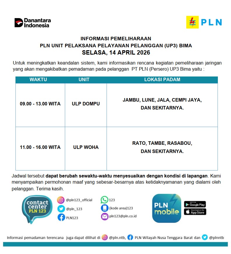 Informasi Pemeliharaan Jaringan PT. PLN (Persero) UP3 Bima, Selasa 14 April 2026 timlensaposntbApril 13, 2026April 13, 202638 Dilihat Post Views: 38 Pos terkaitBerbenah Cepat, Inovasi Kepala Sekolah Baru Sulap SDN 1 Melayu Jadi Asri dan RamahRaih Penghargaan Sekolah Terbersih, SDN 11 Manggemaci Terus Berinovasi Selaraskan Program Kota Bima “BISA”Informasi Pemeliharaan Jaringan PT. PLN (Persero) UP3 Bima, Sabtu 18 April 2026Dompu Perlu Social Safety Net untuk PengangguranKejari Bima Raih Dua Penghargaan Anugerah Reksa Bandha dari DJKN Bali NusraDandim 1608/Bima Pimpin Langsung Jumat Berkah, Tebar Kepedulian untuk Anak-anak SLB Kota Bima