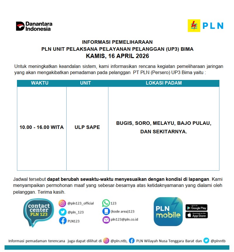 Informasi Pemeliharaan Jaringan PT. PLN (Persero) UP3 Bima, Kamis 16 April 2026 timlensaposntbApril 15, 2026April 15, 202647 Dilihat Post Views: 47 Pos terkaitBerbenah Cepat, Inovasi Kepala Sekolah Baru Sulap SDN 1 Melayu Jadi Asri dan RamahRaih Penghargaan Sekolah Terbersih, SDN 11 Manggemaci Terus Berinovasi Selaraskan Program Kota Bima “BISA”Informasi Pemeliharaan Jaringan PT. PLN (Persero) UP3 Bima, Sabtu 18 April 2026Dompu Perlu Social Safety Net untuk PengangguranKejari Bima Raih Dua Penghargaan Anugerah Reksa Bandha dari DJKN Bali NusraDandim 1608/Bima Pimpin Langsung Jumat Berkah, Tebar Kepedulian untuk Anak-anak SLB Kota Bima