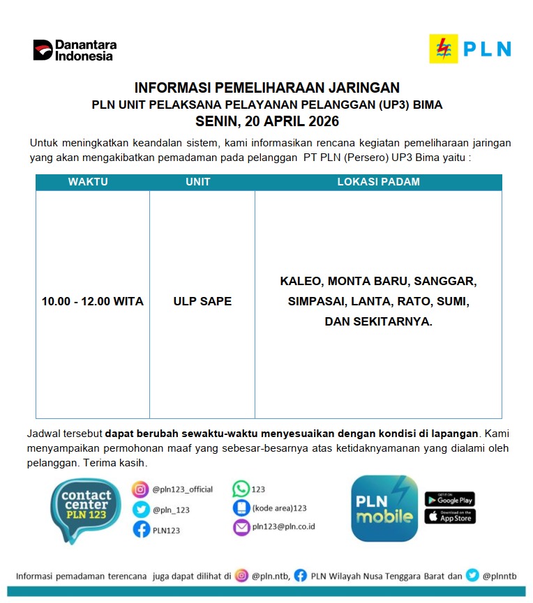 Informasi Pemeliharaan Jaringan PT. PLN (Persero) UP3 Bima, Senin 20 April 2026 timlensaposntbApril 19, 2026April 19, 202619 Dilihat Post Views: 19 Pos terkaitPenerimaan Mahasiswa Baru Akbid Surya Mandiri Bima (SMB) Tahun Akademik 2026/2027Safari Mobil Maung di Amahami Diserbu Warga, Kodim 1608/Bima Kenalkan Karya Anak BangsaInovasi Hebat! SDN 1 Melayu Kota Bima Ubah Limbah MBG Jadi Eco EnzymPatroli Cipta Kondisi, Koramil 1608-01/ Rasanae Sikat Knalpot Racing Pengganggu WargaForum Anak: Alat Pencitraan Pemerintah Daerah?Bupati Bima Rotasi 10 Pejabat Eselon II, Ini Daftar Lengkapnya