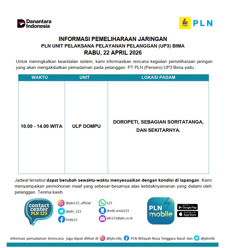 Informasi Pemeliharaan Jaringan PT. PLN (Persero) UP3 Bima, Rabu 22 April 2026 timlensaposntbApril 21, 2026April 21, 202627 Dilihat Post Views: 27 Pos terkaitSiPropam Polres Bima Kota Gencarkan Sosialisasi Rekrutmen Polri Bersih Lewat Banner dan PamfletPatroli Cipta Kondisi, Koramil 1608-01/ Rasanae Ajak Warga Jaga Keamanan LingkunganIndra Sukma Resmi Pimpin Lapas Khusus Sentul, Karier Melejit dari Rutan Raba hingga LPKA TomohonSiap Berangkat! 221 Jamaah Haji Kota Bima Sudah Terima Seluruh PerlengkapanKoordinator Pengawas SD Monitoring Pelaksanaan TKA di SDN 1 Melayu Kota BimaInformasi Pemeliharaan Jaringan PT. PLN (Persero) UP3 Bima, Selasa 21 April 2026