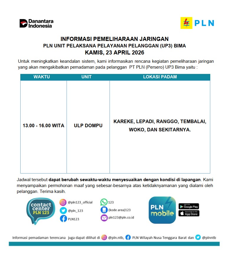 Informasi Pemeliharaan Jaringan PT. PLN (Persero) UP3 Bima, Kamis 23 April 2026 timlensaposntbApril 23, 2026April 23, 202625 Dilihat Post Views: 25 Pos terkaitSafari Mobil Maung Kodim 1608/Bima Sambangi SDN 10 Penatoi, Tanamkan Nasionalisme dan Gerakan Kota Bima “BISA”Patroli Malam Koramil 1608-01/ Rasanae Sisir Kota Bima, Tindak Tegas Knalpot Racing Demi Kamtibmas KondusifTKA Hari Kedua di SDN 19 Rabangodu Utara Berjalan Lancar, Dikpora Kota Bima Terus Lakukan PemantauanDompu Perlu Peta Talenta PemudaSatu Siswa SDN Lambu Belum Ikut TKA, Terkendala Administrasi Perpindahan DataKasat Lantas Polres Bima Kota Hadiri Rapat Persiapan Festival Rimpu Mantika 2026, Pengamanan dan Rekayasa Lalu Lintas Dibahas