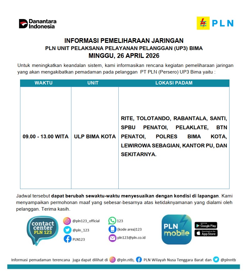 Informasi Pemeliharaan Jaringan PT. PLN (Persero) UP3 Bima, Minggu 26 April 2026 timlensaposntbApril 25, 2026April 25, 202631 Dilihat Post Views: 31 Pos terkaitKawal Hari Kedua Festival Rimpu Mantika, Jauhar Mahbub Imbau Penonton Jaga KebersihanMTsN 2 Kota Bima Tampil Semangat dan Percaya Diri di Pawai Rimpu Mantika 2026Wow Spektakuler! SMPN 1 Kota Bima Pecah Rekor Peserta Terbanyak di Pawai Rimpu, Tembus 1.000 OrangHML di Balik Lahirnya Rimpu Mantika, Dari Gagasan hingga Raih Rekor MURILangkah Kompak SMPN 1 Kota Bima Warnai Kemegahan Pawai Rimpu Mantika 2026Klaim Swasembada Amran Disorot, Defiyan Cori Singgung Soal Impor