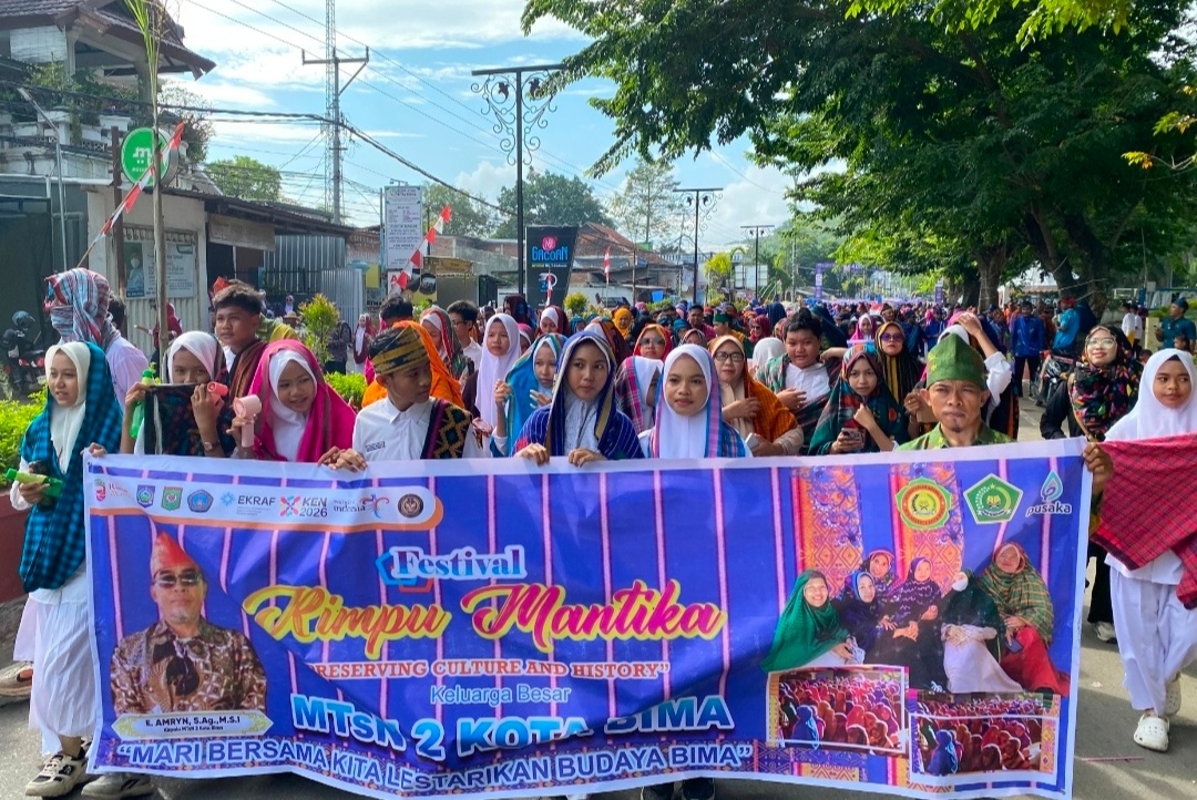 Kegiatan ini dipimpin langsung oleh Kepala MTsN 2 Kota Bima, Edi Amryn, yang turut mendampingi seluruh peserta dalam pawai tersebut.Tidak hanya sekadar mengikuti pawai, MTsN 2 Kota Bima hadir membawa pesan kuat tentang pentingnya menjaga identitas budaya di tengah perkembangan zaman.