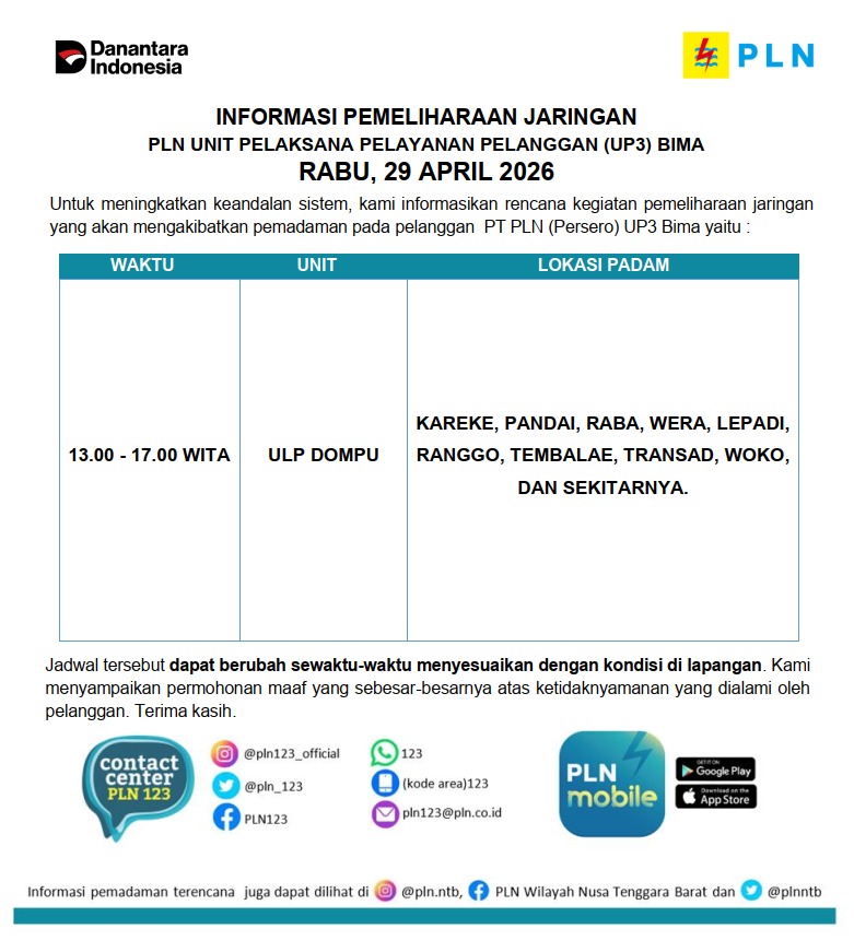 Informasi Pemeliharaan Jaringan PT. PLN (Persero) UP3 Bima, Rabu 29 April 2026 timlensaposntbApril 28, 2026April 28, 202614 Dilihat Post Views: 14 Pos terkaitBareskrim Bongkar Aliran Dana Rp211 Miliar, Jejak Bandar Narkoba Ko Erwin Terendus hingga MalaysiaTinjau Korban Kecelakaan Kereta di Bekasi, Jasa Raharja Telah Terbitkan Jaminan Biaya Perawatan ke 8 RSJasa Raharja Pastikan Jaminan bagi Korban Kecelakaan Kereta Api di Stasiun Bekasi TimurAndi Fardian Tembus Kampus Dunia, 34 Bukunya Jadi Koleksi Perpustakaan hingga Luar NegeriKolaborasi Jasa Raharja–DPP Organda: Tiga Inisiatif Utama untuk Transformasi Transportasi PublikPemkot Bima Terima Penghargaan dari Dirjen Pemasyarakatan pada Puncak HBP ke-62 di Rutan Raba